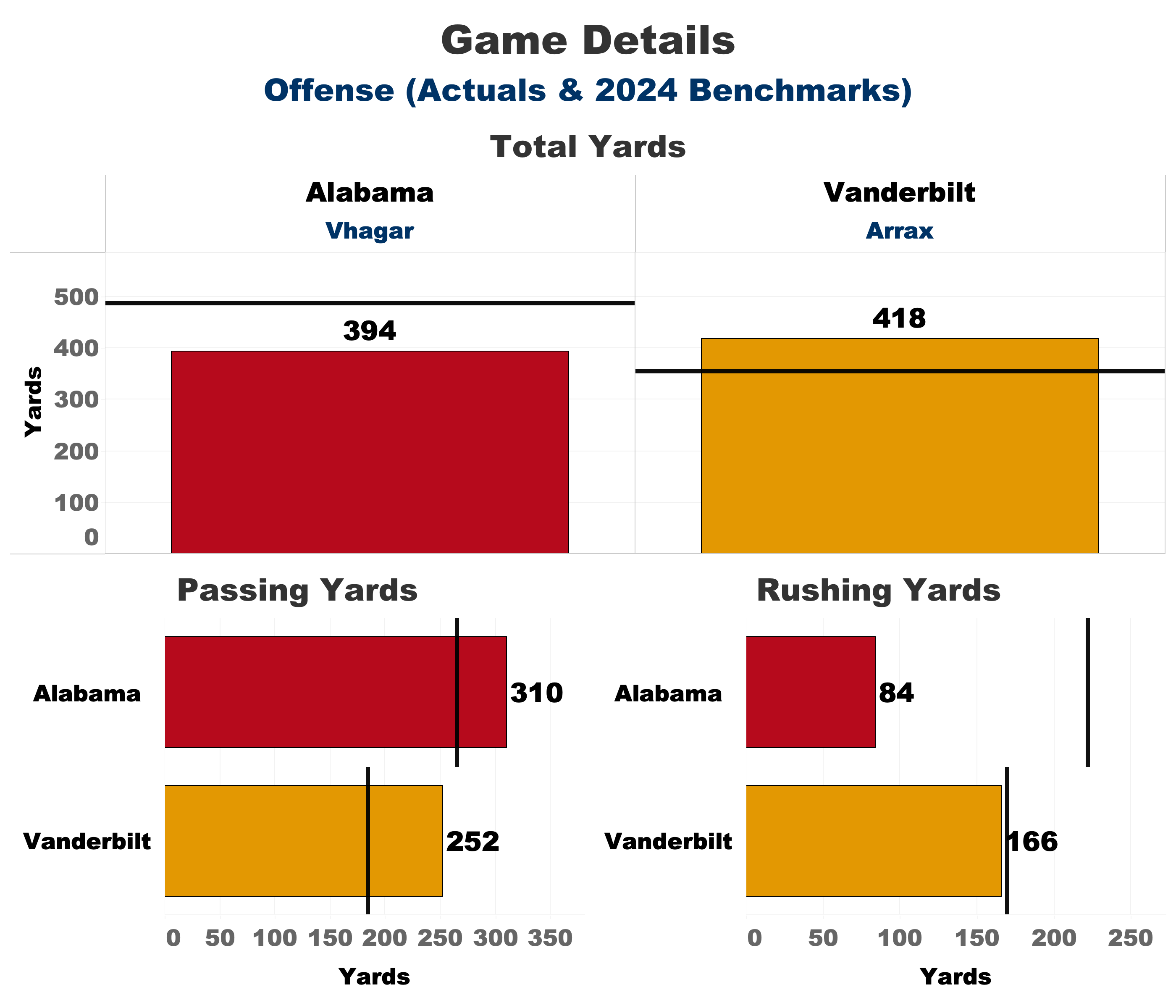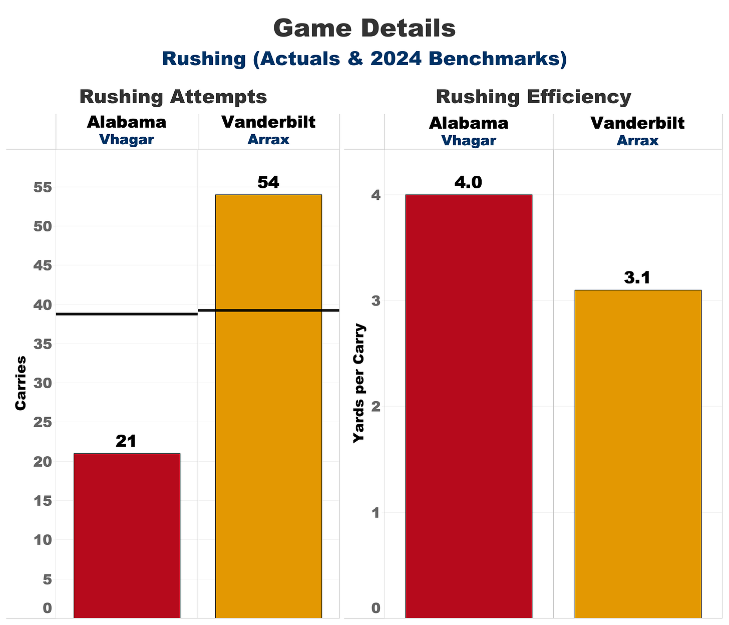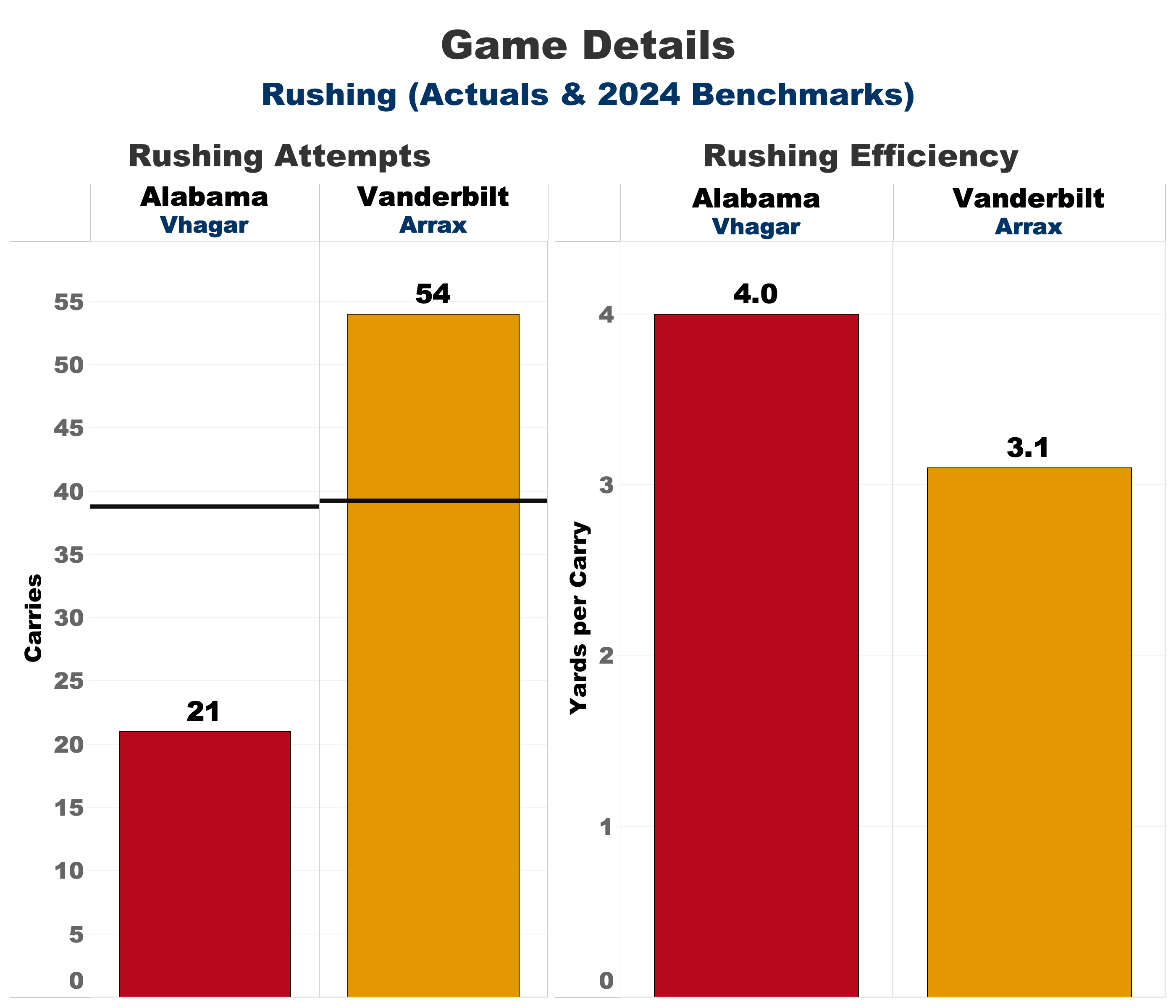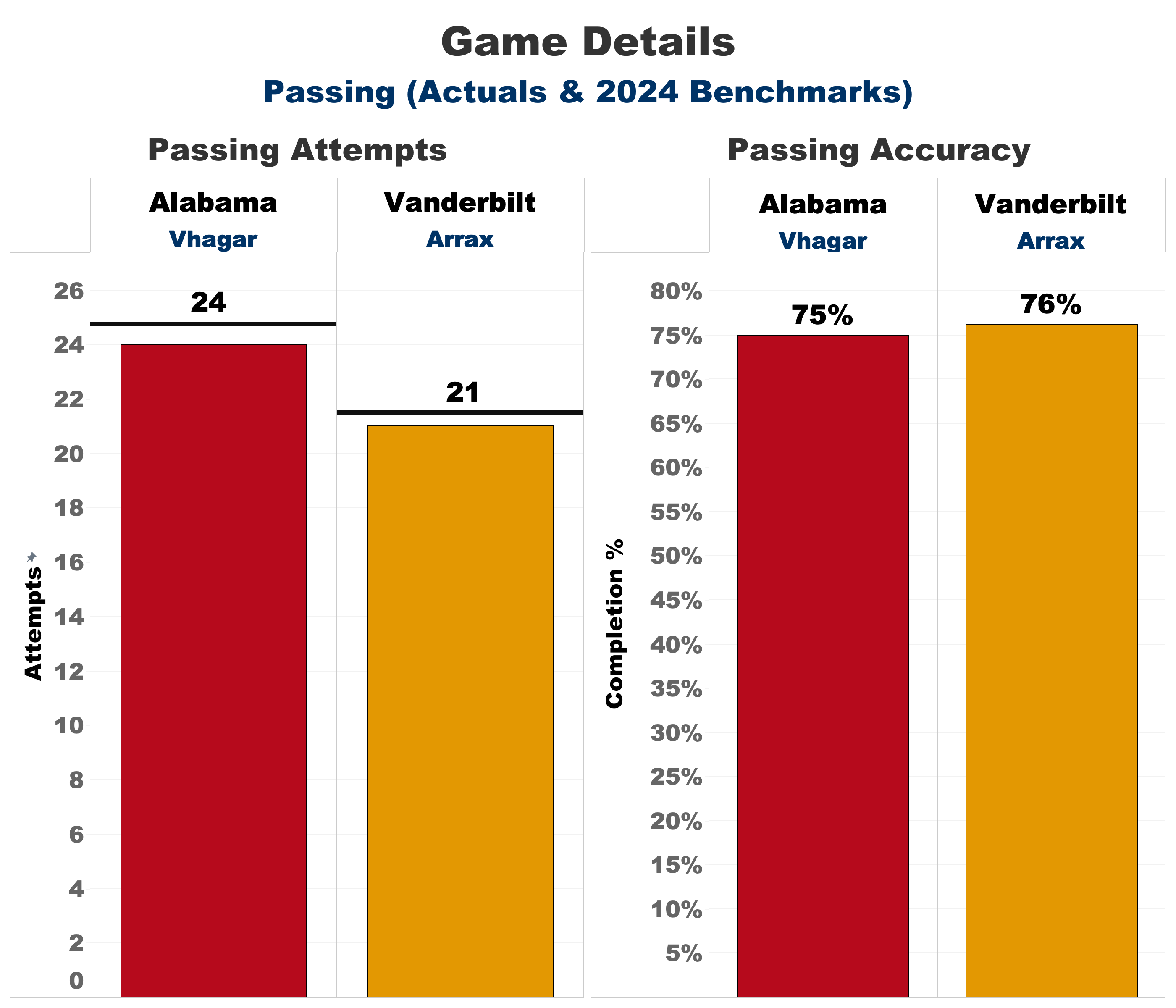 Alabama made 24 passing attempts and Vanderbilt made 21. It was slightly, and also comparably, below average for both squads. The teams were also almost identical in terms of passing accuracy. Jalen Milroe was 75% accurate on his attempts and Diego Pavia was 80% accurate. The team-wide 76% accounts for a 0/1 stat from Nate Johnson, Vanderbilt’s backup QB.