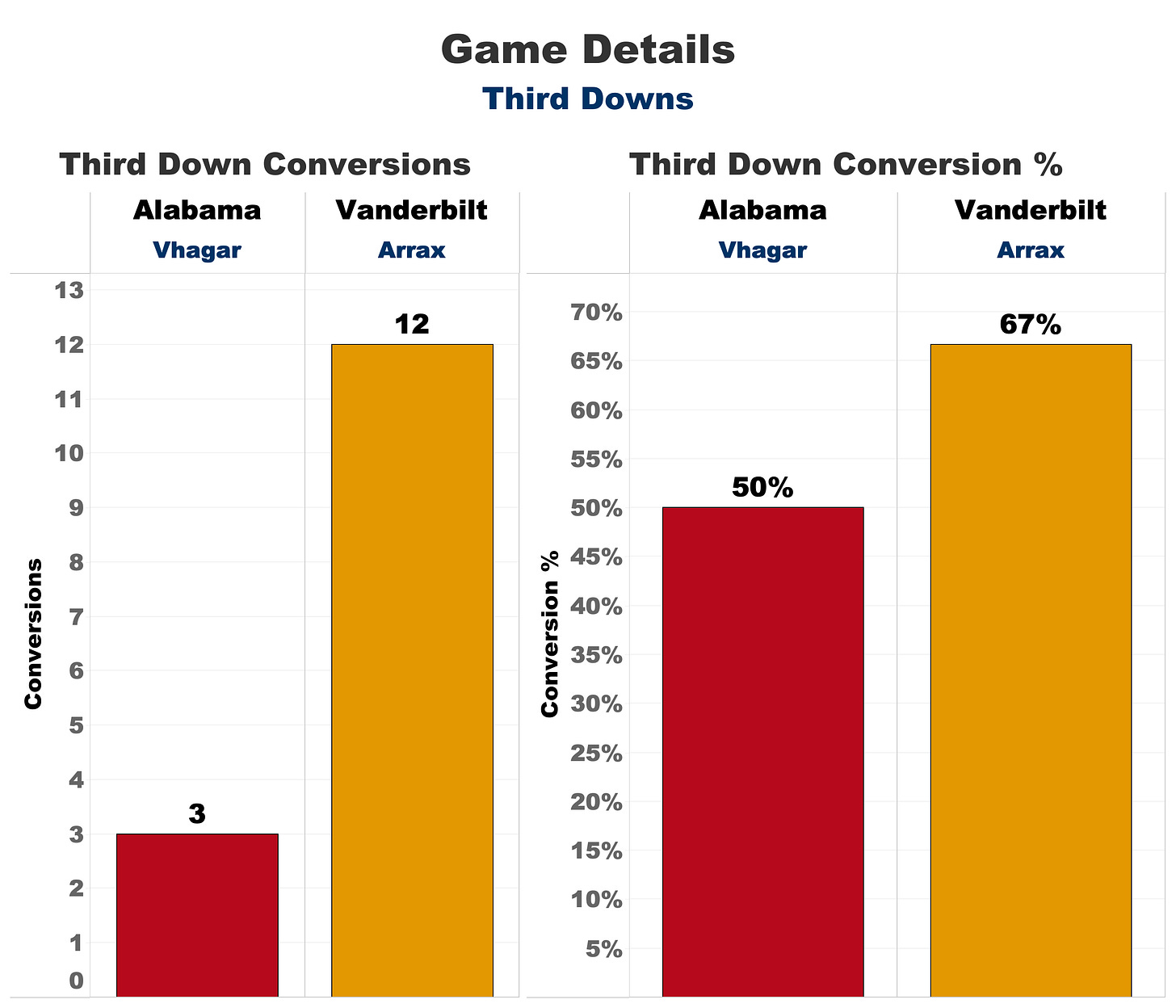 Vandy put up a whopping 54 rushing carries against Alabama. Their average per game going into the matchup was 39. The Crimson Tide recorded 21 rushing carries, well below their average of 38 in the season’s 1st four games. Alabama had the edge I terms of efficiency, with 4 yards per carry compared to Vandy’s 3.1 yards per carry. But Vanderbilt’s strategy did what it needed to do and the Commodore’s had 42:08 minutes of possession time while the Crimson Tide’s offense only had the ball for 17:52 minutes.